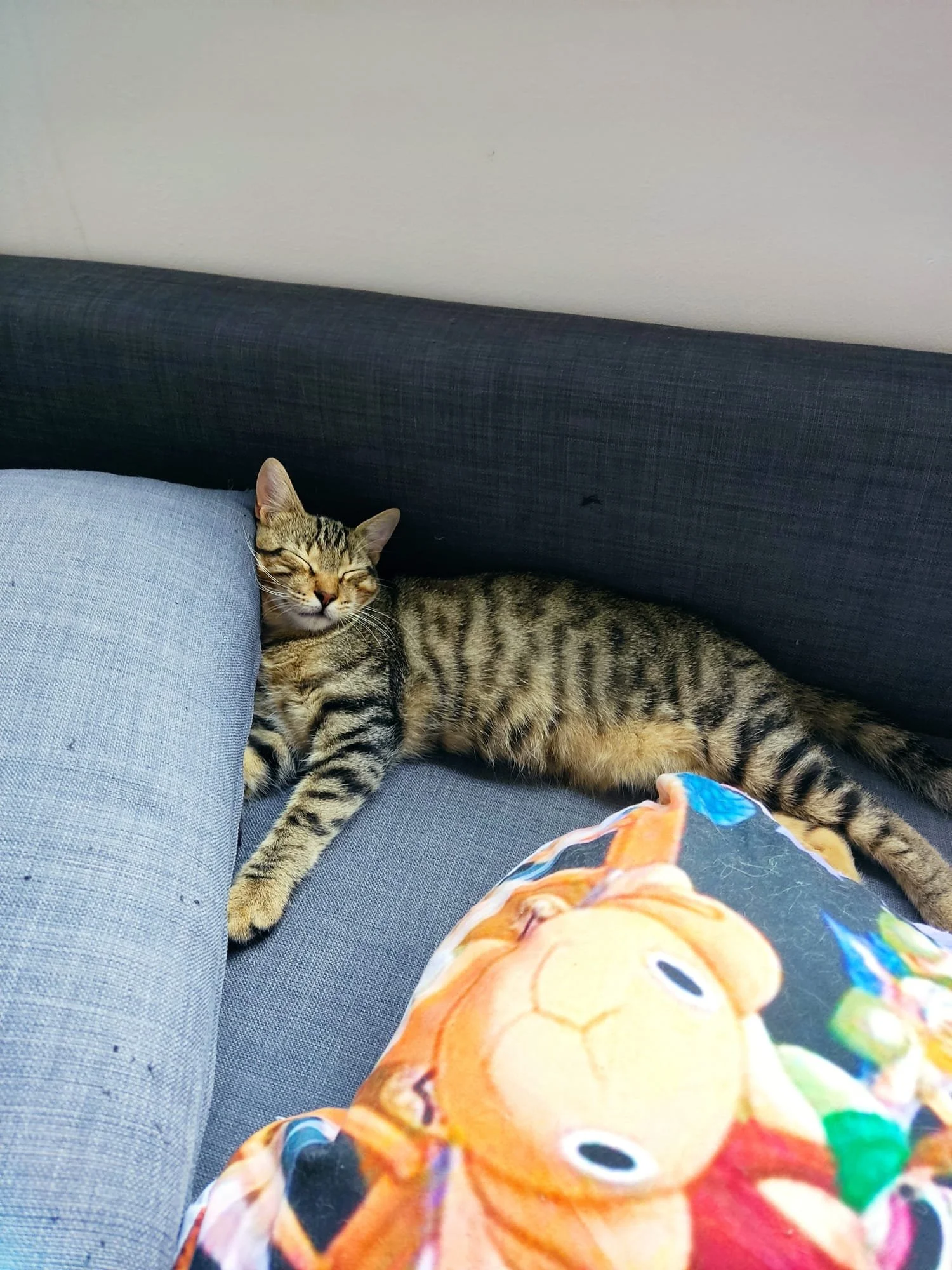 In general, his day is composed of asking for cuddles, eating, playing, and sleeping (while cuddling…two for one!) When he sleeps, you’ll find him in very strange positions that will be sure to make you laugh. We’re not sure how he is even comfortable in most of them!