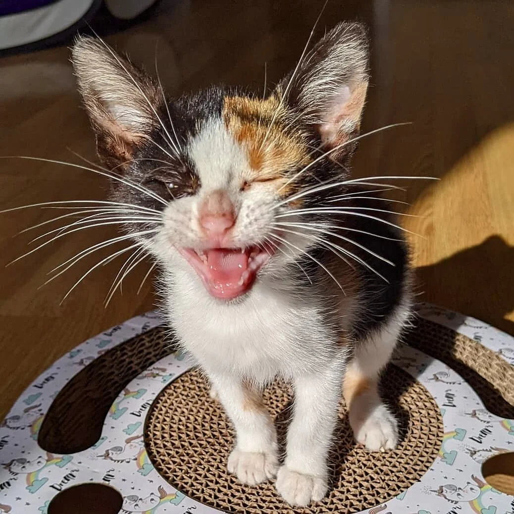 Personality: Bonnet knows what Bonnet wants. She is opinionated, and will meow at you to express these opinions: she meows when she wants something, meows for food, meows to be let out of pen, meows for strokes, meows for playtime, meows if you're stroking her in the wrong place, meows if you're not playing her game right. She is very sweet, loves having company and responds with a fervour to being patted. She crawls up under your chin to be as close as possible. Her new favourite game is to use her foster mum's legs as a stalking platform when she's hunting her feather toy. She's a very good hunter even though she's so young. Her pounce is very accurate 😼 She is a dear girl who was found inside a car engine and we don't know how she got there. She has been easy since day one, and will be an amazing addition to any family. She needs company, and we will only adopt her to a home alongside another of our kittens or to someone who already has a cat who is a good personality match and is looking for a friend.