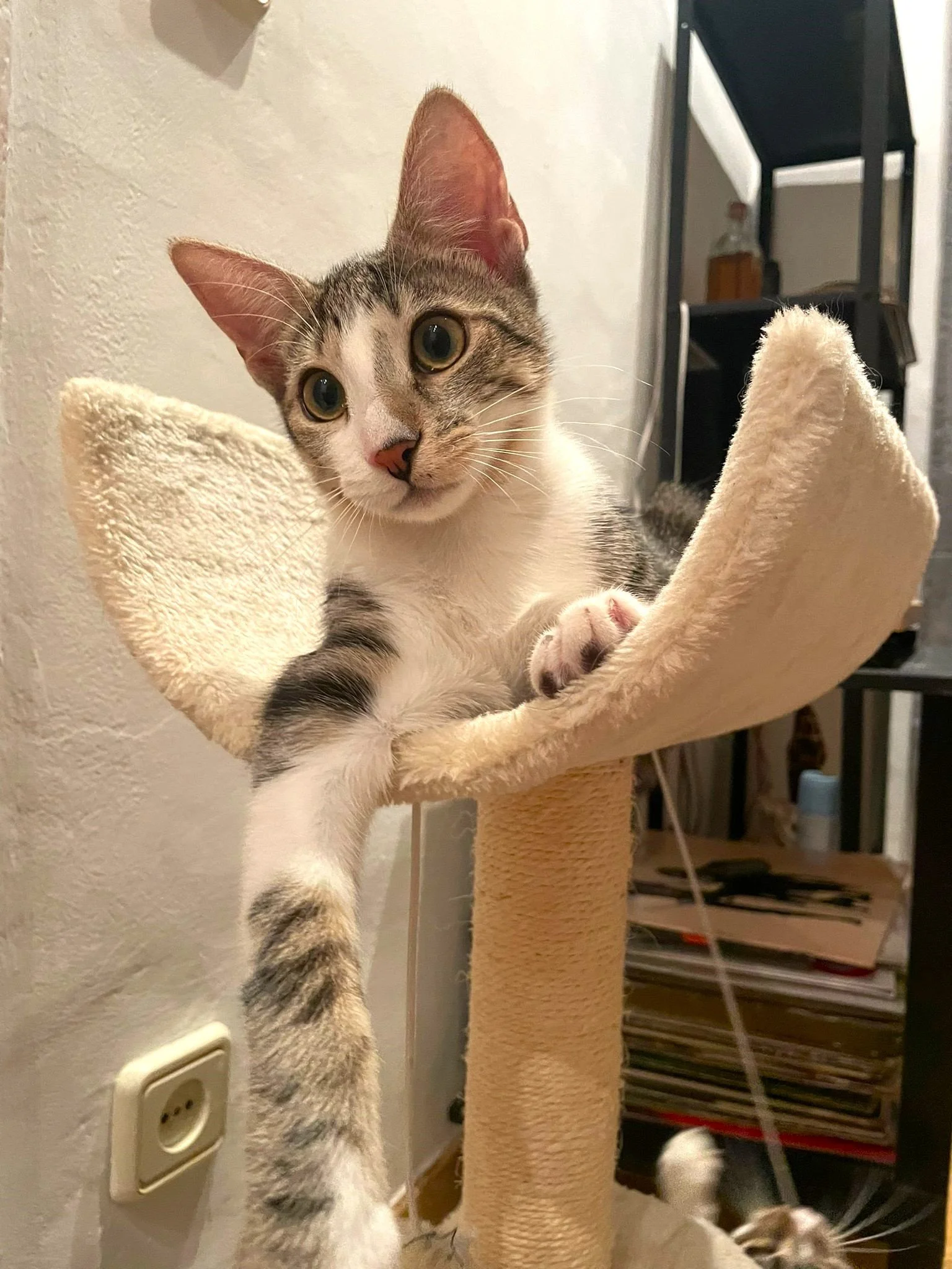 At first, he was more reserved than his sister, but he took the lead and suddenly his bravery started to blossom. Seeing that his sister was the number one explorer, he couldn’t be left behind. Eddie plays the role of protective brother and loves to sleep cuddled up with Estela, but he also enjoys being pampered like the little brother. Like any good sibling, it's not all sweet moments—sometimes cuddles turn into immobilizing hugs followed by playful bites that make you squeal 😹 Despite their mischievous games, one thing is clear: they can’t live without each other.