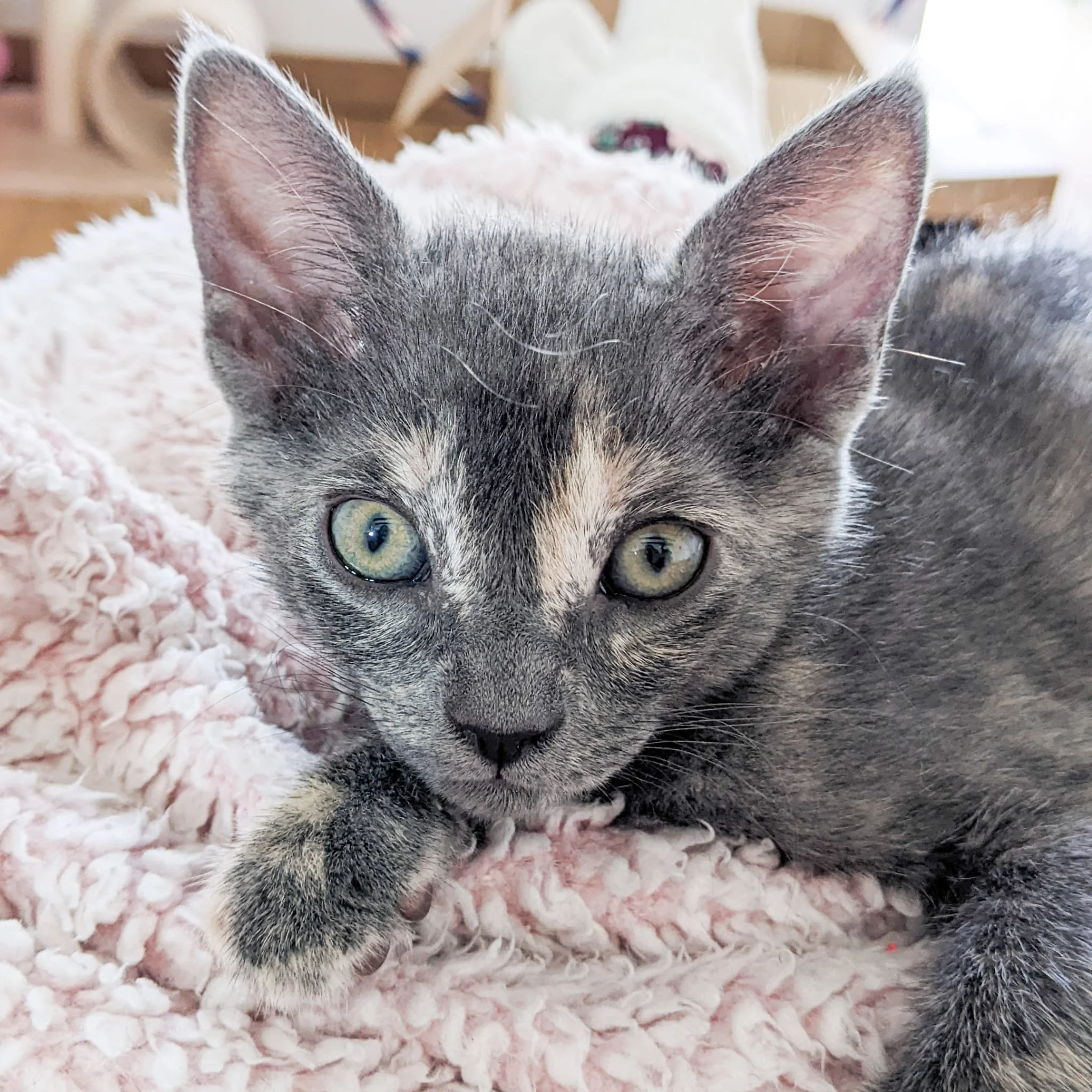 Es una gatita fácil y se lleva bien con sus dos hermanos. Le encanta esconderse en cajas y saltar encima de ellos. Ella perseguirá a su hermana Coco y está a cargo del higiene de todos.