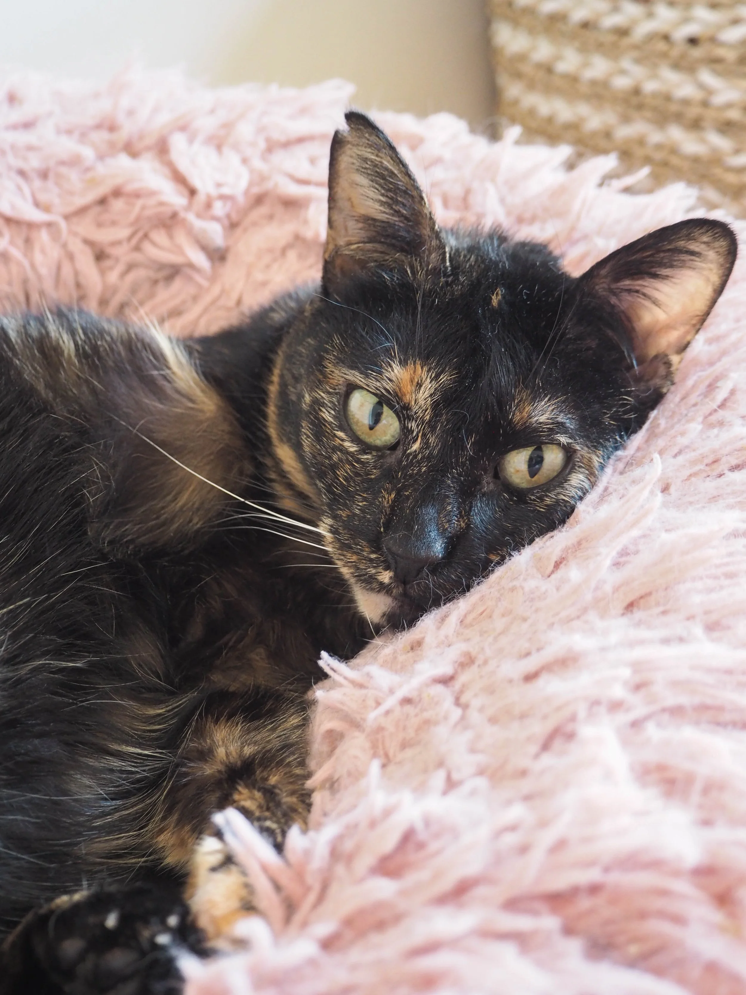 She is very calm. She almost always rests in her little wicker box or inside the scratching post cave. She is independent: you know she’s there, but each of you has your own space. A mature relationship, without demands. Her attitude is clear — not to bother anyone, to go unnoticed, to stay quietly in the background.