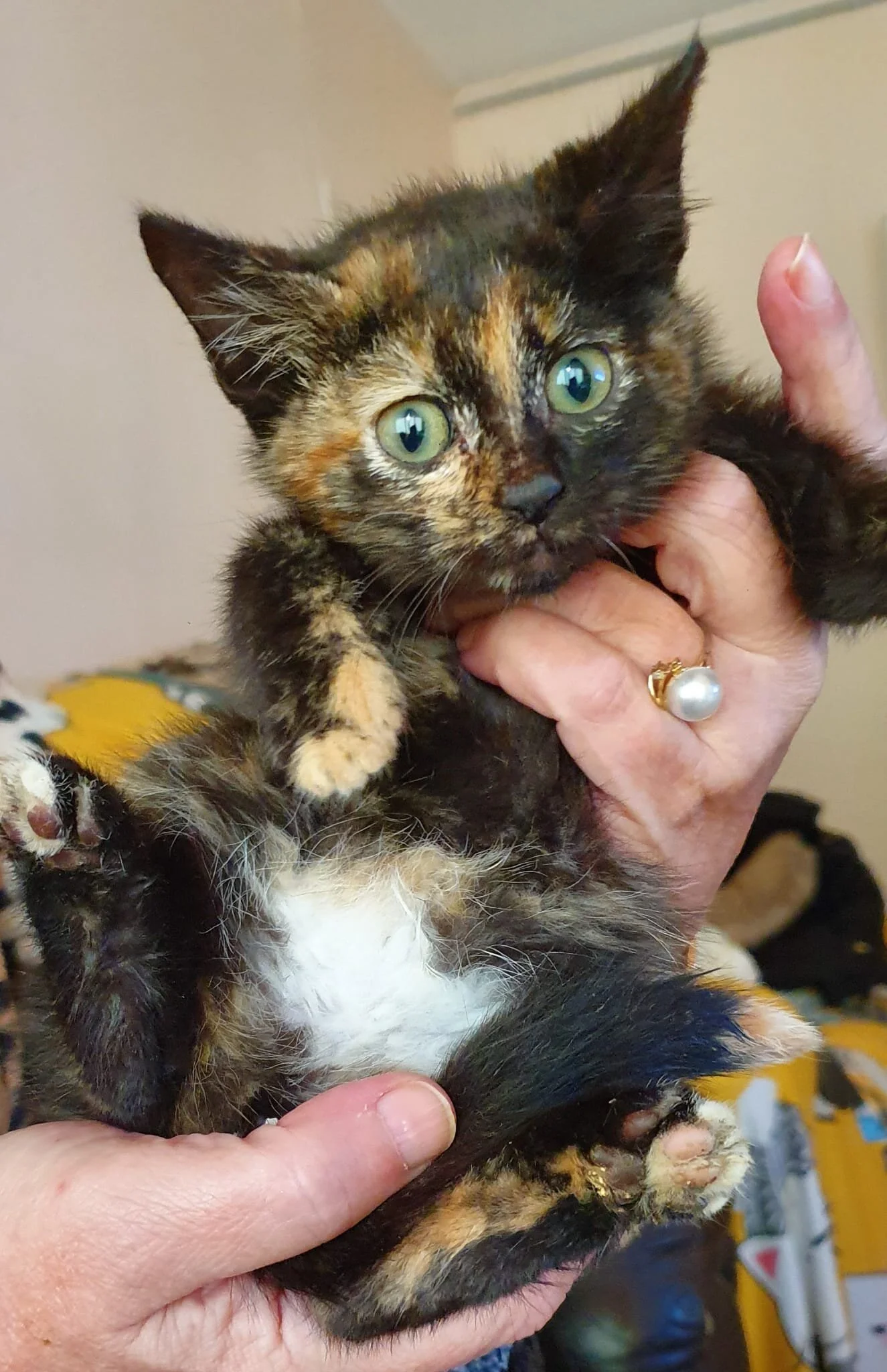 Personality: Beautiful tortoiseshell ball of fluff Shirley is the quieter of two siblings. She happily follows her brother into a play session, but also loves some downtime in your arms and is a little purr machine. Both she and her brother are intelligent cats who can figure out toys (and escaping their playpen when they're in it!) very quickly.
